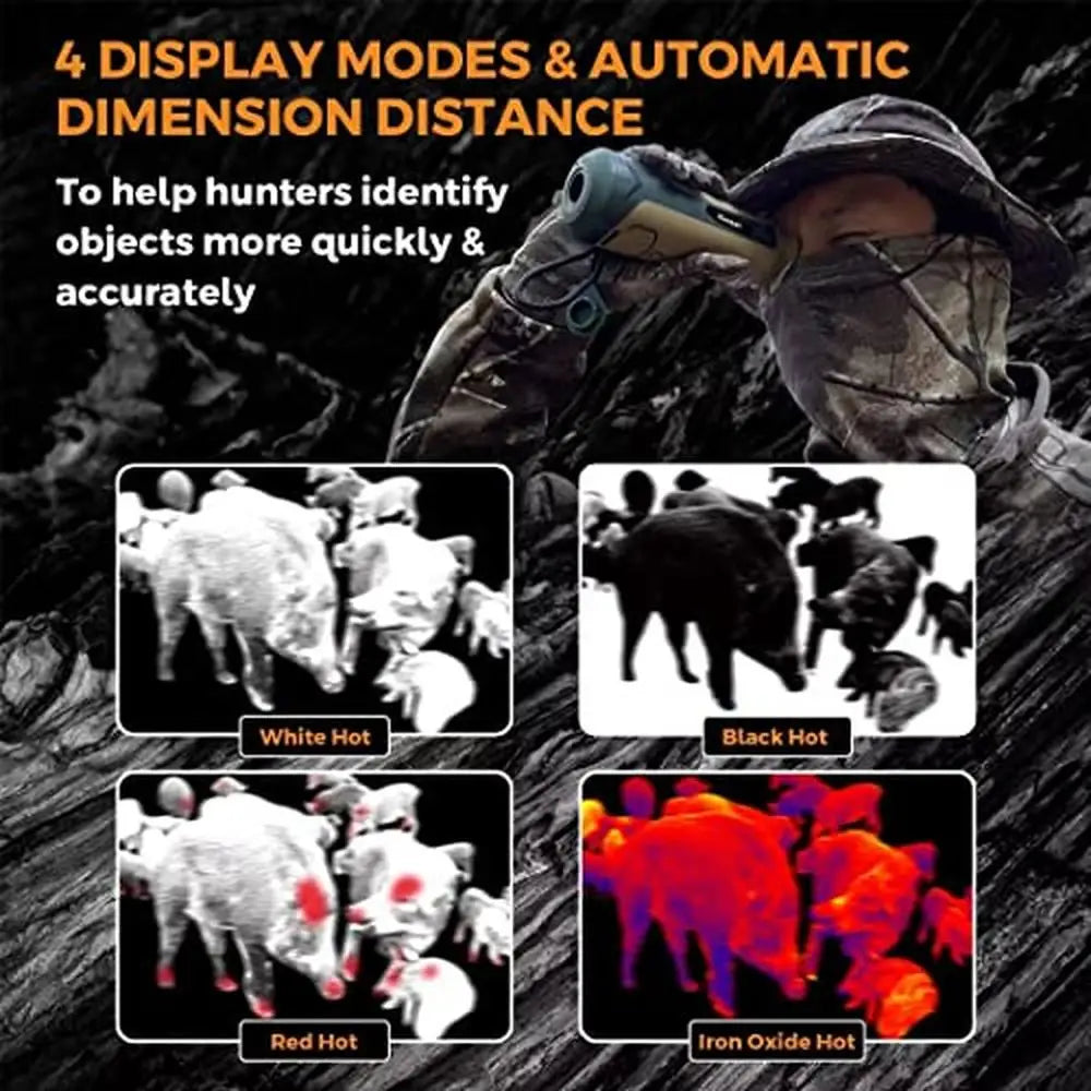 4 Display Modes & Display The Distance Automatically - The color palette of this digital monocular offers 4 display modes - White Hot, Black Hot, Red Hot, Iron Oxide Hot. With its hassle-free distance measurement feature, simply mark the top and bottom of a target on the screen, and the interface will automatically display the distance of the target from the monocular, to help hunters identify objects more quickly & accurately.