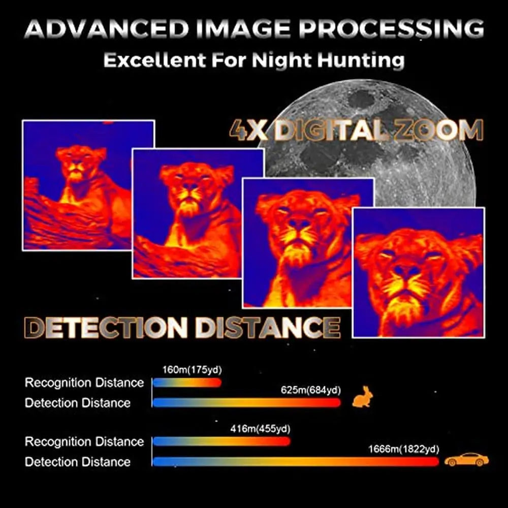 Advanced Image Processing - Designed to be precise, the thermal monocular has a thermal imaging sensor with 256x192 effective pixels and 4X digital zoom. The recognition distance of this night vision monocular is up to 455 yards for vehicles and 175 yards for animals. This thermal imaging monocular produces vivid video images through its enhanced detector and image processing algorithm, excellent For Night Hunting.